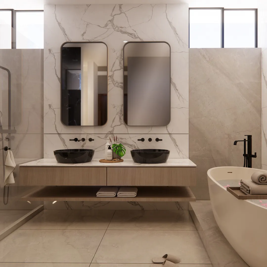 El baño principal se distingue por la combinación de tonalidades grises: un piso antideslizante mate en contraste con muros marmoleados de acabado brillante. La grifería y el lavamanos en mármol negro aportan un toque de lujo, logrando un ambiente práctico que conjuga diseño y sofisticación.