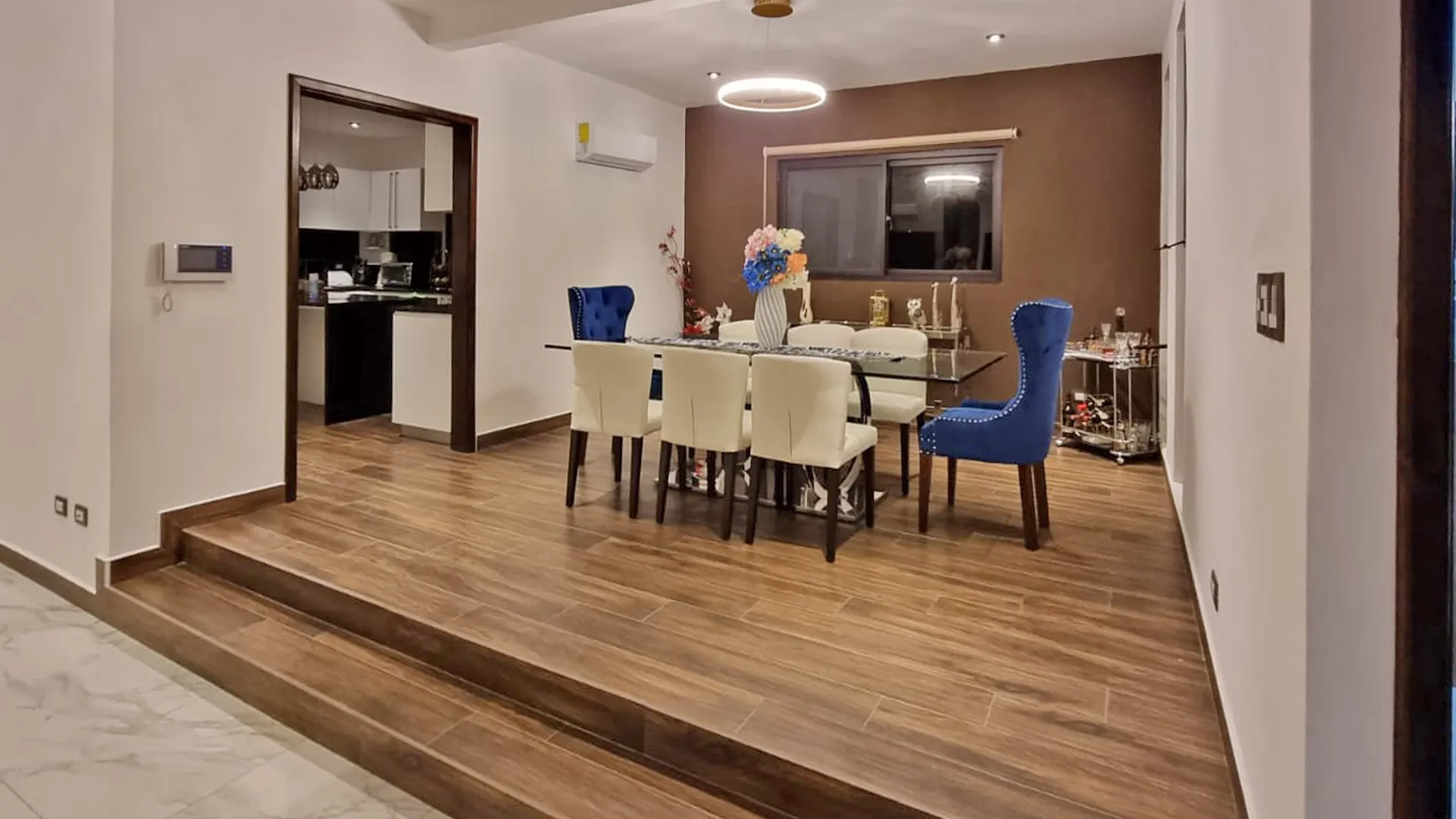 La sala refleja una gran amplitud gracias a su doble altura, y la cercanía al pozo de iluminación realza los detalles del muro principal, donde se fusiona con un centro de entrenimiento rodeado por un mural acabado en calacatta white para generar contraste con los tonos negros y madera que lo enmarcan.