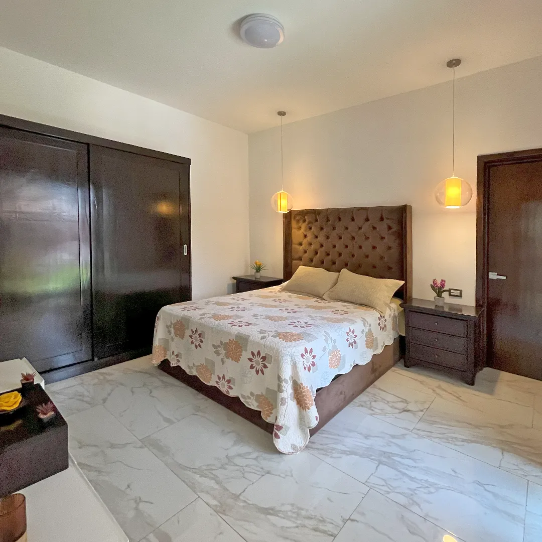 El dormitorio principal cuenta con gran amplitud y disposición estratégica de iluminación que realza la arquitectura única de la habitación. Cuenta con acceso a un balcón privado con vista hacia el área verde de la residencia, además un acceso al walk-in closet, que separa totalmente el ambiente, brindando el mayor confort y privacidad posible.