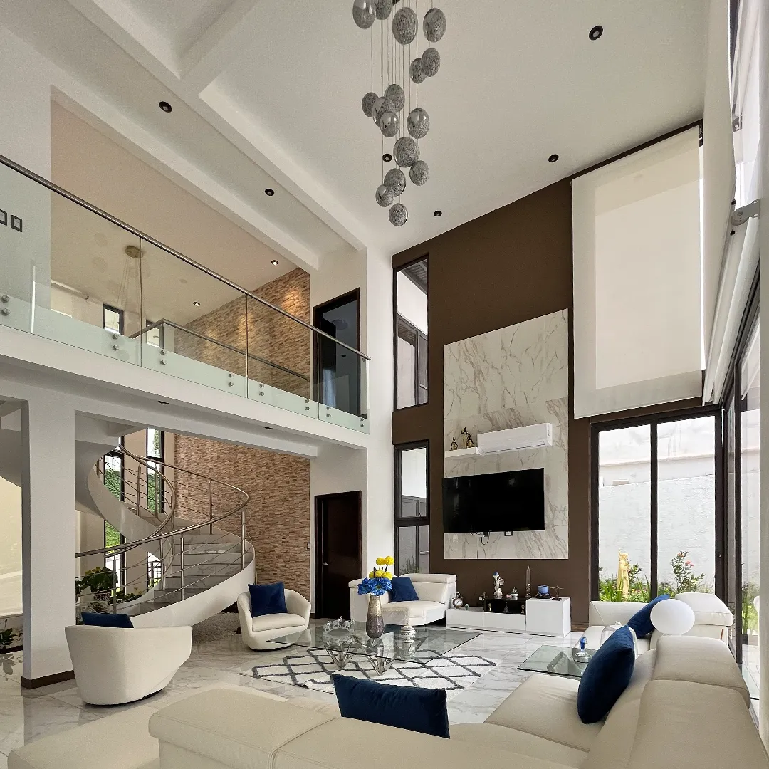 Es una residencia que se integra de forma amigable con el entorno natural, aprovechando la vegetación existente para crear pozos de iluminación y ventilación natural que brindan amplitud a los espacios, mezclados con arquitectura contemporánea y acabados exclusivos como piso calacatta en tonos blancos y negros que le dan elegancia a los ambientes.